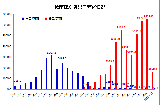 据越南财政部海关总局(GENERAL DEPARTMENT OF CUSTOMS,MINISTRY OF FINANCE OF VIETNAM)发布的商品进出口数据显示,2026年1-3月,越南煤炭进口量累计为1658.38万吨,比上年同期下降3.4%。其中,3月份煤炭进口量为542.7万吨,同比下降16.7%,环比增长9.6%。