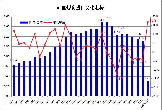 据韩国海关(Korea Customs Service -KCS)发布的最新统计数据显示,2026年1-3月,韩国煤炭进口量累计为2942.5万吨,比上年同期增长16.9%。其中,3月份煤炭进口量为882.15万吨,同比增长26.3%,环比下降8.4%。