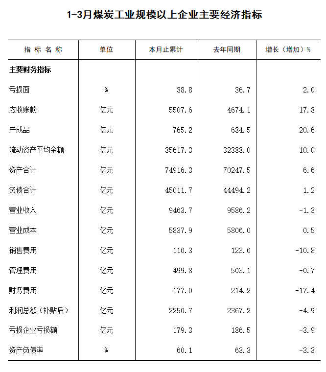 2023年一季度煤炭工业规模以上企业主要经济指标