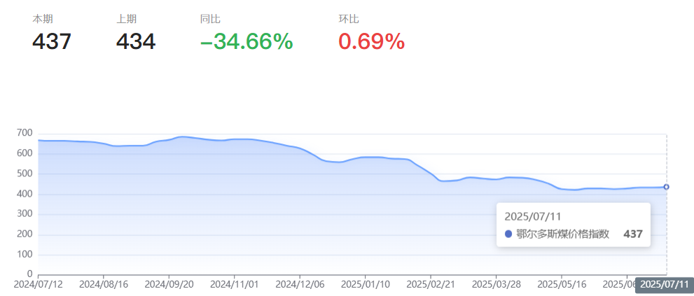 本报告周期(2025年7月5日--2025年7月11日,下同),鄂尔多斯煤价格指数报收437点,环比上涨3点,涨幅0.69%,同比下降34.66%。