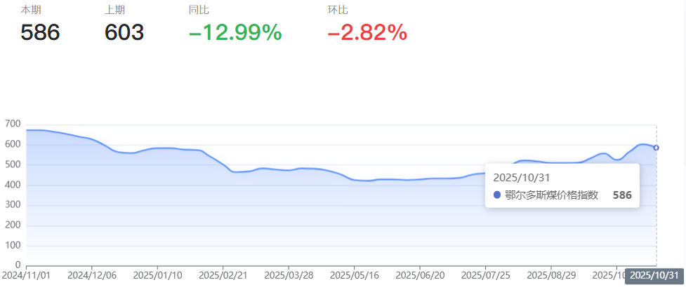 本报告周期(2025年10月25日--2025年10月31日,下同),鄂尔多斯煤价格指数报收586点,环比下降17点,降幅2.82%,同比下降12.99%。