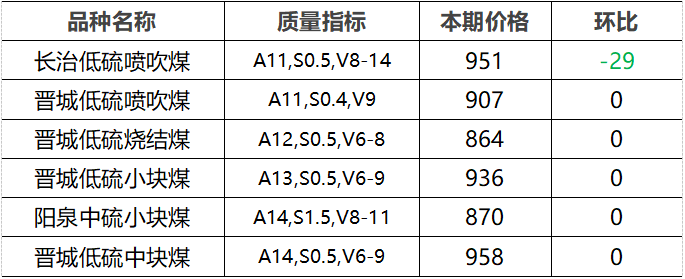 3.无烟煤市场稳中偏弱,块煤价格持稳,长治地区喷吹煤价格小幅下跌。