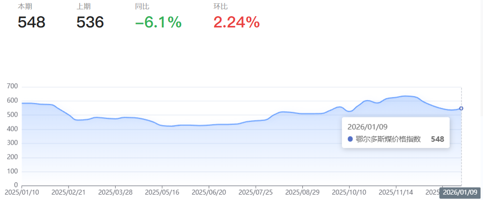 本报告周期(2026年1月3日--2026年1月9日,下同),鄂尔多斯煤价格指数报收548点,环比上涨12点,涨幅2.24,同比下降6.1%。