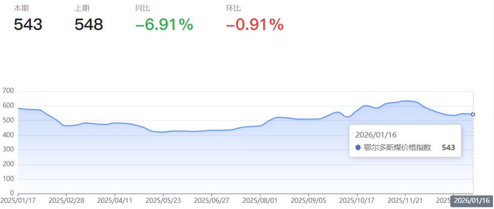 本报告周期(2026年1月10日--2026年1月16日,下同),鄂尔多斯煤价格指数报收543点,环比下降5点,降幅0.91,同比下降6.91%。