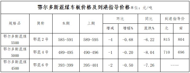 二、鄂尔多斯混煤车板价格及到港指导价格