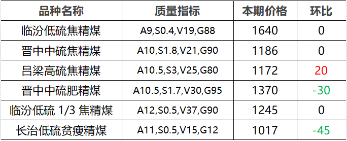 价格行情:炼焦煤市场观望氛围较浓,产地煤价小幅涨跌。省内主要煤企炼焦煤长协车板价格维持稳定;坑口销售价格涨跌互现,吕梁地区主焦煤市场价格上涨20元/吨,晋中、长治地区配焦煤市场价格下跌30-45元/吨不等。