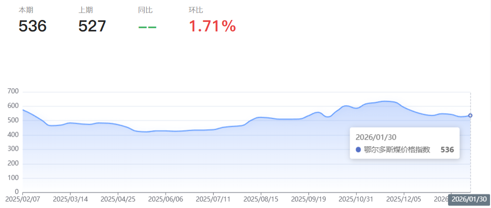 本报告周期(2026年1月24日--2026年1月30日,下同),鄂尔多斯煤价格指数报收536点,环比上涨9点,涨幅1.71%。