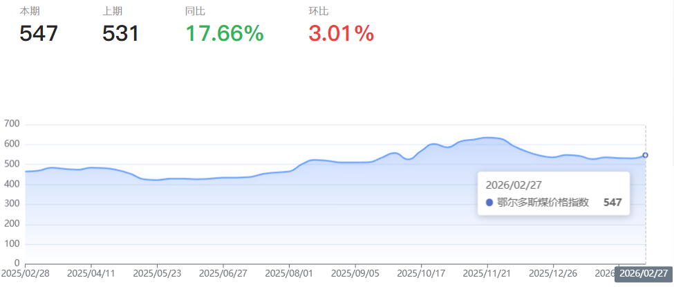 本报告周期(2026年2月21日--2026年2月27日,下同),鄂尔多斯煤价格指数报收547点,环比上涨16点,增幅3.01%,同比上涨17.66%。