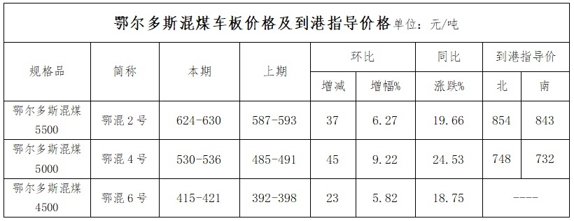 二、鄂尔多斯混煤车板价格及到港指导价格