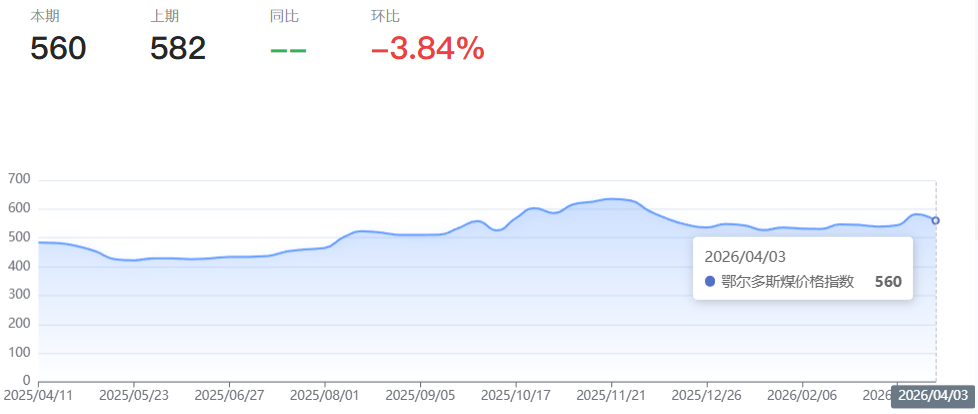 本报告周期(2026年3月28日--2026年4月3日,下同),鄂尔多斯煤价格指数报收560点,环比下降22点,降幅3.84%。