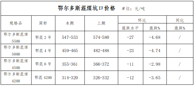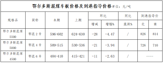 二、鄂尔多斯混煤车板价格及到港指导价格