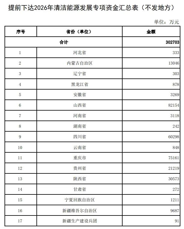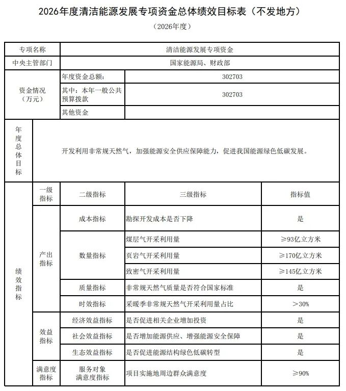 根据《清洁能源发展专项资金管理办法》(财建〔2025〕35号)有关要求,现提前下达2026年清洁能源发展专项资金(以下简称专项资金)预算,用于支持煤层气、页岩气、致密气等非常规天然气开采利用,待2026年预算年度开始后按程序拨付使用,具体金额见附件。现将有关事项通知如下: