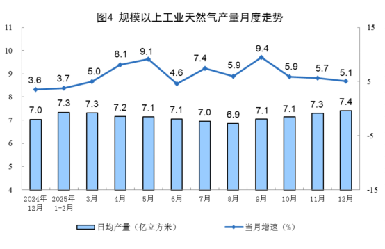 天然气生产平稳增长。12月份,规上工业天然气产量230亿立方米,同比增长5.1%;日均产量7.4亿立方米。1—12月份,规上工业天然气产量2619亿立方米,同比增长6.2%。