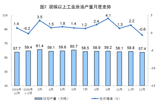 原油生产保持稳定。12月份,规上工业原油产量1780万吨,同比下降0.6%;日均产量57.4万吨。1—12月份,规上工业原油产量21605万吨,同比增长1.5%。