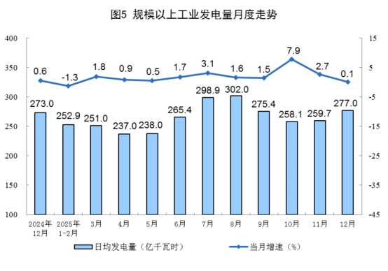 规上工业电力生产保持增长。12月份,规上工业发电量8586亿千瓦时,同比增长0.1%;日均发电量277.0亿千瓦时。1—12月份,规上工业发电量97159亿千瓦时,同比增长2.2%。