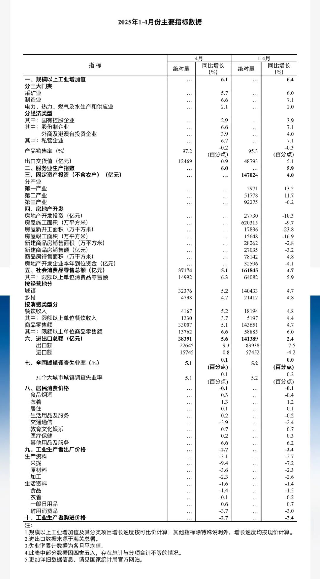总的来看,4月份,外部冲击影响加大,但宏观政策协同发力,主要指标平稳较快增长,国民经济延续向新向好态势。也要看到,外部不稳定不确定因素仍然较多,国民经济持续回升向好基础还需进一步稳固。下阶段,要坚持以习近平新时代中国特色社会主义思想为指导,坚决贯彻落实党中央、国务院决策部署,坚持稳中求进工作总基调,完整准确全面贯彻新发展理念,加快构建新发展格局,统筹国内经济工作和国际经贸斗争,坚定不移办好自己的事,坚定不移扩大高水平对外开放,着力稳就业、稳企业、稳市场、稳预期,扎实推进高质量发展,推动经济持续回升向好。