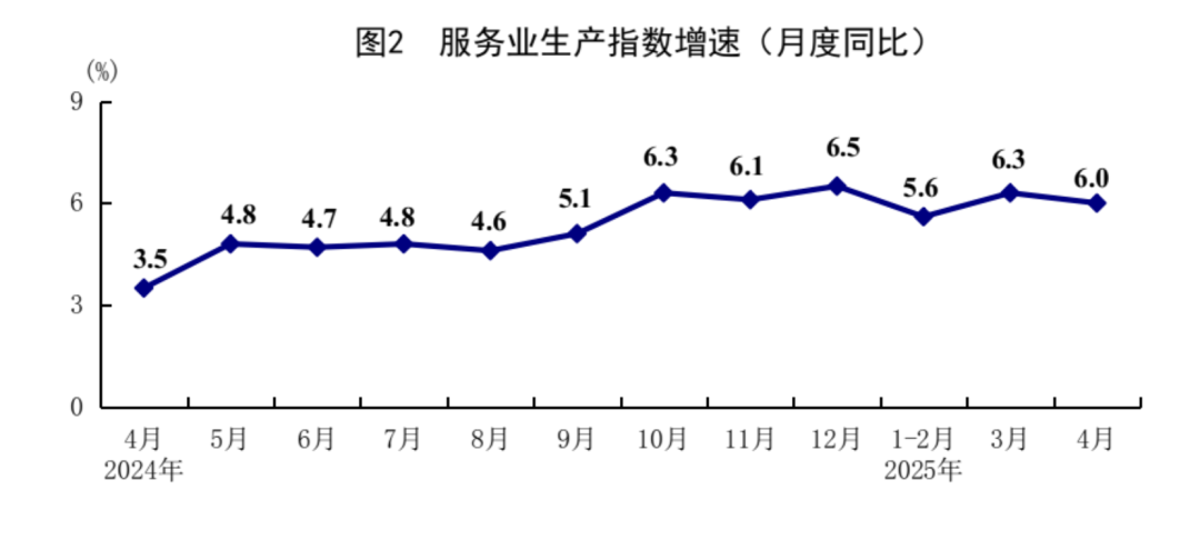 4月份,全国服务业生产指数同比增长6.0%。分行业看,信息传输、软件和信息技术服务业,租赁和商务服务业,批发和零售业,金融业生产指数同比分别增长10.4%、8.9%、6.8%、6.1%,分别快于服务业生产指数4.4、2.9、0.8、0.1个百分点。1-4月份,全国服务业生产指数同比增长5.9%。1-3月份,规模以上服务业企业营业收入同比增长7.0%。4月份,服务业商务活动指数为50.1%,服务业业务活动预期指数为56.4%。其中,航空运输、电信广播电视及卫星传输服务、互联网软件及信息技术服务、保险等行业商务活动指数位于55.0%以上较高景气区间。