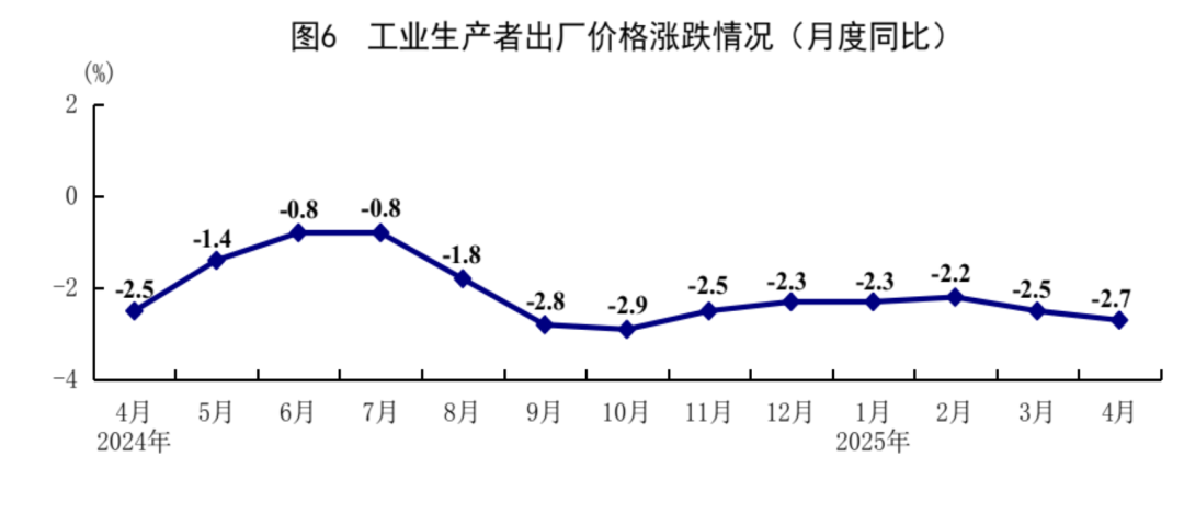 4月份,全国工业生产者出厂价格同比下降2.7%,环比下降0.4%;全国工业生产者购进价格同比下降2.7%,环比下降0.6%。1-4月份,全国工业生产者出厂价格和购进价格均比上年同期下降2.4%。