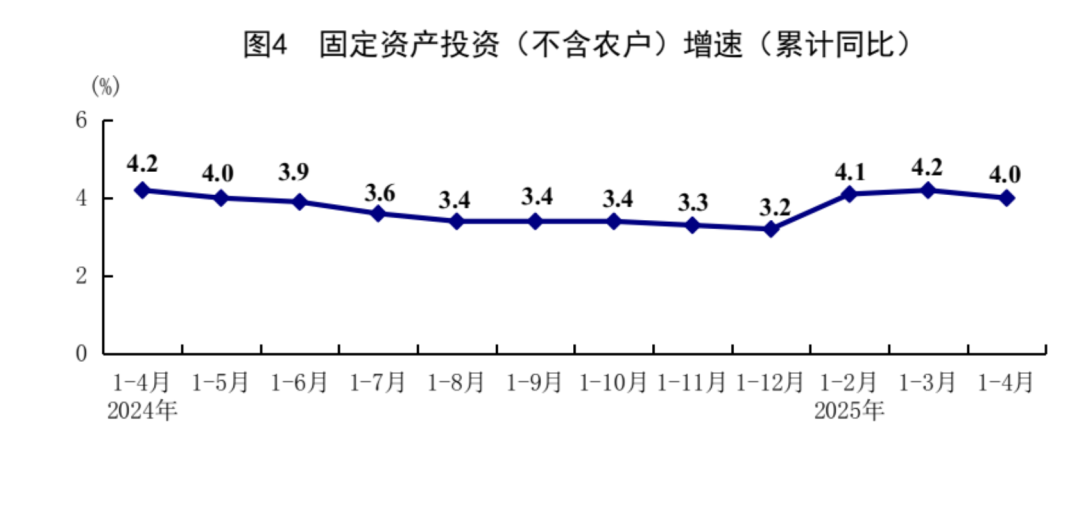 1-4月份,全国固定资产投资(不含农户)147024亿元,同比增长4.0%;扣除房地产开发投资,全国固定资产投资增长8.0%。分领域看,基础设施投资同比增长5.8%,制造业投资增长8.8%,房地产开发投资下降10.3%。全国新建商品房销售面积28262万平方米,同比下降2.8%;新建商品房销售额27035亿元,下降3.2%。分产业看,第一产业投资同比增长13.2%,第二产业投资增长11.7%,第三产业投资下降0.2%。民间投资同比增长0.2%;扣除房地产开发投资,民间投资增长5.8%。高技术产业中,信息服务业,计算机及办公设备制造业,航空、航天器及设备制造业,专业技术服务业投资同比分别增长40.6%、28.9%、23.9%、17.6%。4月份,固定资产投资(不含农户)环比增长0.10%。