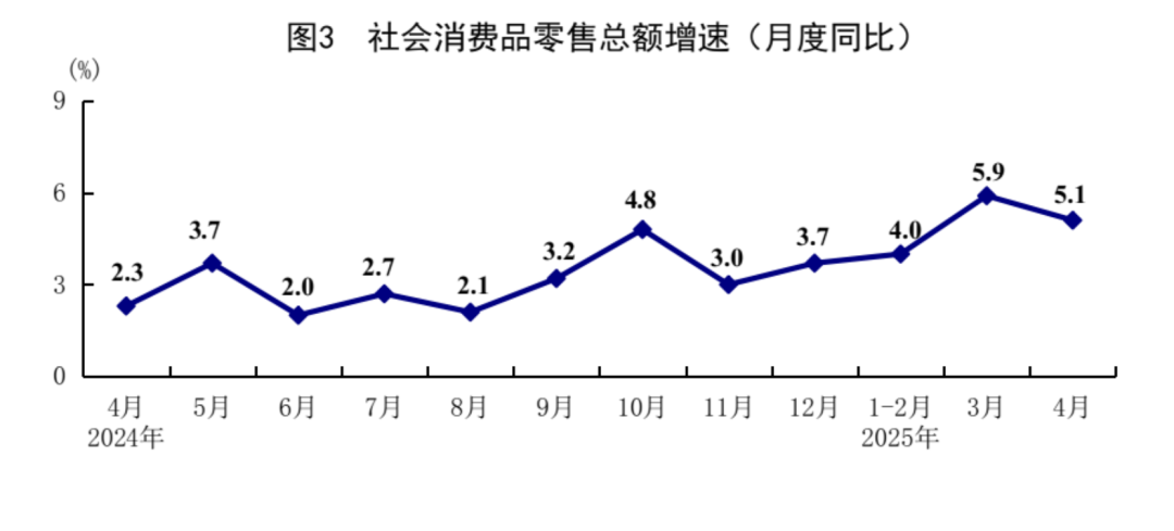 4月份,社会消费品零售总额37174亿元,同比增长5.1%;环比增长0.24%。按经营单位所在地分,城镇消费品零售额32376亿元,同比增长5.2%;乡村消费品零售额4798亿元,增长4.7%。按消费类型分,商品零售额33007亿元,增长5.1%;餐饮收入4167亿元,增长5.2%。基本生活类和部分升级类商品销售增势较好,限额以上单位粮油食品类、体育娱乐用品类商品零售额分别增长14.0%、23.3%。消费品以旧换新政策持续显效,限额以上单位家用电器和音像器材类、文化办公用品类、家具类、通讯器材类商品零售额分别增长38.8%、33.5%、26.9%、19.9%。1-4月份,社会消费品零售总额161845亿元,同比增长4.7%。全国网上零售额47419亿元,同比增长7.7%。其中,实物商品网上零售额39265亿元,增长5.8%,占社会消费品零售总额的比重为24.3%。1-4月份,服务零售额同比增长5.1%。