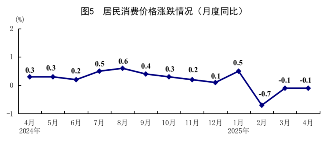 4月份,全国居民消费价格(CPI)同比下降0.1%,环比上涨0.1%。分类别看,食品烟酒价格同比上涨0.3%,衣着价格上涨1.3%,居住价格上涨0.1%,生活用品及服务价格上涨0.2%,交通通信价格下降3.9%,教育文化娱乐价格上涨0.7%,医疗保健价格上涨0.2%,其他用品及服务价格上涨6.6%。在食品烟酒价格中,鲜菜价格下降5.0%,粮食价格下降1.4%,猪肉价格上涨5.0%,鲜果价格上涨5.2%。扣除食品和能源价格后的核心CPI同比上涨0.5%。1-4月份,全国居民消费价格同比下降0.1%。