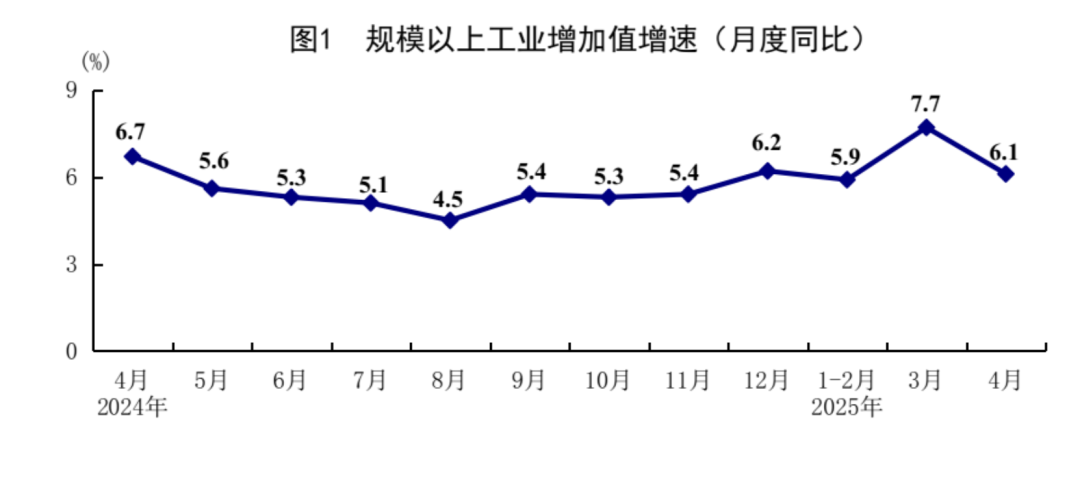 4月份,全国规模以上工业增加值同比增长6.1%,环比增长0.22%。分三大门类看,采矿业增加值同比增长5.7%,制造业增长6.6%,电力、热力、燃气及水生产和供应业增长2.1%。装备制造业增加值同比增长9.8%,高技术制造业增加值增长10.0%,分别快于全部规模以上工业增加值3.7和3.9个百分点。分经济类型看,国有控股企业增加值同比增长2.9%;股份制企业增长6.6%,外商及港澳台投资企业增长3.9%;私营企业增长6.7%。分产品看,3D打印设备、工业机器人、新能源汽车产品产量同比分别增长60.7%、51.5%、38.9%。1-4月份,全国规模以上工业增加值同比增长6.4%。4月份,制造业采购经理指数为49.0%,企业生产经营活动预期指数为52.1%。1-3月份,全国规模以上工业企业实现利润总额15094亿元,同比增长0.8%。