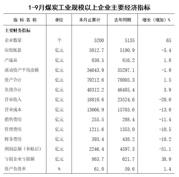 2025年1-9月煤炭工业规模以上企业主要经济指标