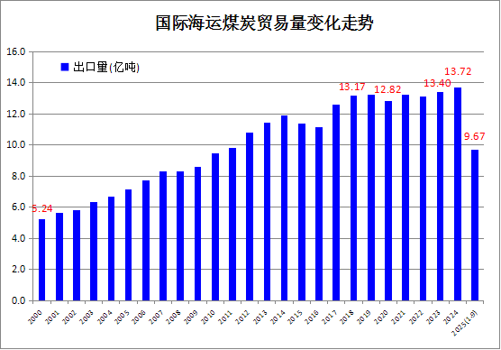 据船舶经纪与服务集团班切罗・科斯塔(Banchero Costa)最新发布的市场周报(MARKET REPORT – WEEK 41/2025),其援引AXS Marine船舶跟踪数据显示,2025 年1-9月,国际海运煤炭船舶载运量(不包括各国国内沿海货物运输)累计为9.674亿吨,比上年同期下降4.3%。