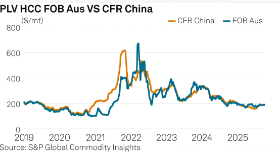 与此同时,普氏能源资讯(Platts)数据显示,2025年前9个月,澳大利亚半硬焦煤(PHCCs)价格获得了南亚地区的价格支持,80笔交易中有68笔的收货目的地为印度。