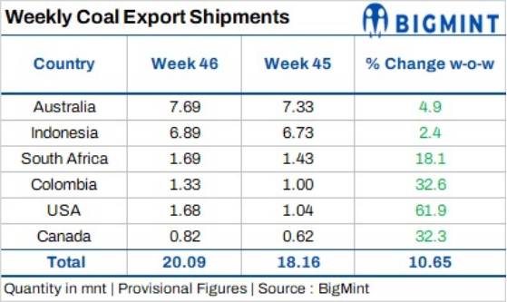 此次周环比增长主要由澳大利亚、印度尼西亚、南非、美国、哥伦比亚和加拿大的出口量增加共同推动。