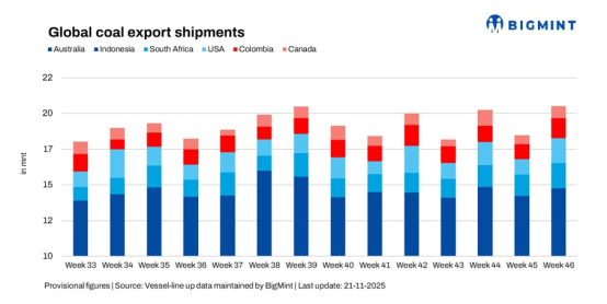 据BigMint 11月21日发布的信息,其整理的船舶运输跟踪数据显示,2025年第46周(11月8日至14日),全球海运煤炭出口量合计达到2009万吨,高于第45周(11月1日至7日)的1816万吨,环比增长10.6%。