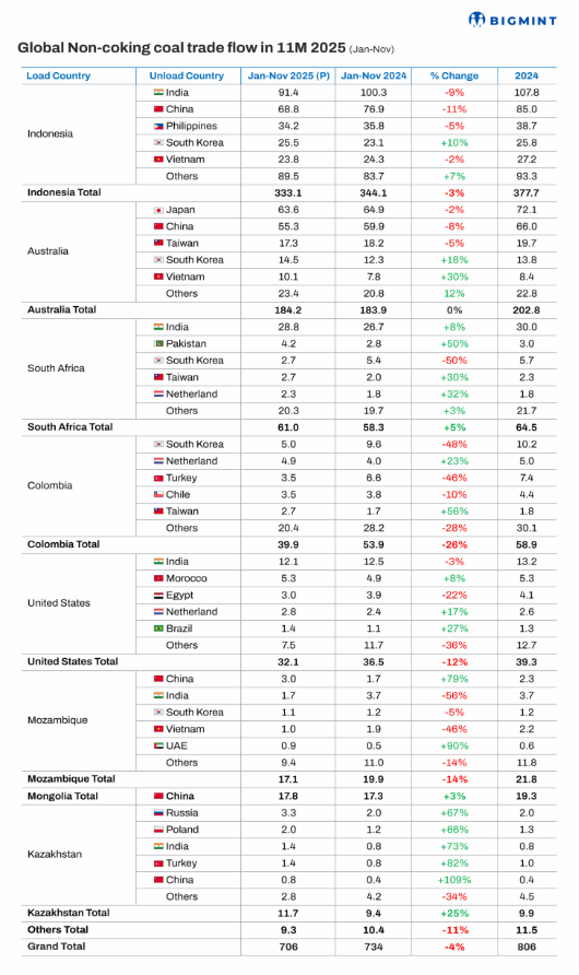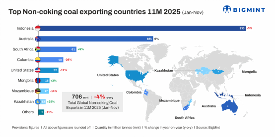 据BigMint 网站12月24日发布的信息, 其整理的初步数据显示,2025年1-11月,全球动力煤(Non Coking Coal,非焦煤)贸易量降至约7.06亿吨,较2024年同期的7.34亿吨减少约2800万吨,同比下降4%。