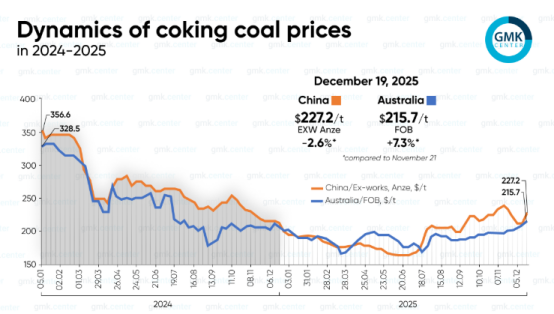 同样,安泽炼焦煤在年末也进入了市场复苏上升阶段。截至12月19日,主焦煤报价为每吨227.2美元,较2024年12月上涨7%,但较前一月下降2.6%。