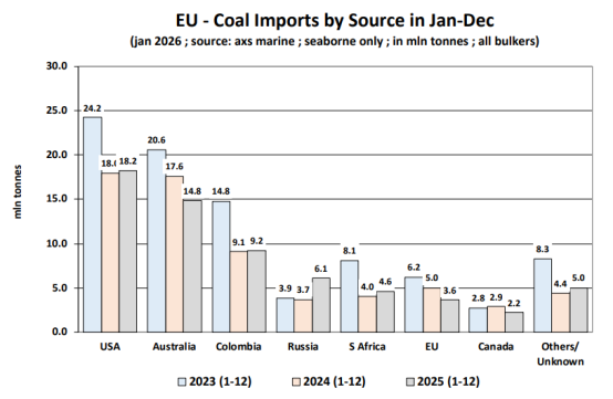 向欧洲供应煤炭的第二大国家是澳大利亚,占欧盟2025年进口量的23.2%, 1-12月澳大利亚对欧盟的煤炭出口量降至1480万吨,同比下降15.9%,已远低于2023年的2060万吨。