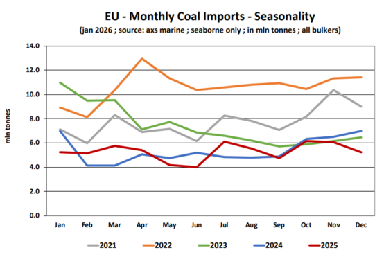 2025年欧盟煤炭进口整体趋于平稳,全年1-12月同比仅微降1.4%,当然仍较2022年大幅下降了50%。