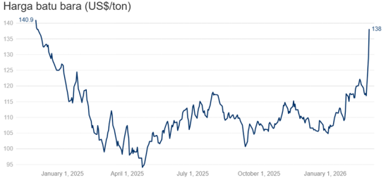 据CNBC 印度尼西亚频道3月4日报道的消息,国际市场煤炭价格在中东局势紧张形势加剧的背景下,跃升至2024年11月以来的最高水平。