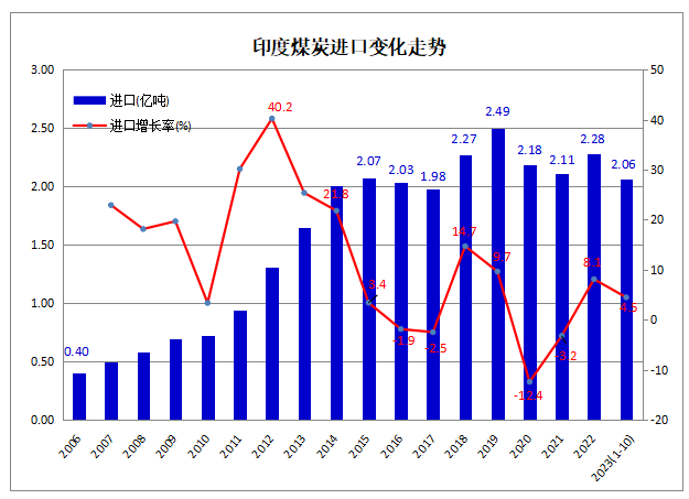 据印度商工部(Ministry of Commerce and Industry)发布的商品进出口统计数据显示,2023年1-10月份,印度煤炭进口量累计为2.06亿吨,比上年同期增长4.5%。其中,10月份煤炭进口同比环比都大幅增长,当月进口量为2639.22万吨,同比增加52.3%,环比增长38.8%。