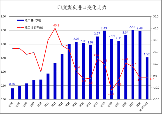 据印度商工部(Ministry of Commerce and Industry)最新发布的煤炭进口数据显示,2025年1-7月,印度煤炭进口量累计为1.52亿吨,较上年同期下降1.7%。