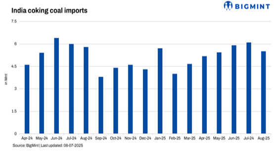 但2025年8月,印度冶金煤进口量为550万吨, 环比7月份的610万吨下降10%。