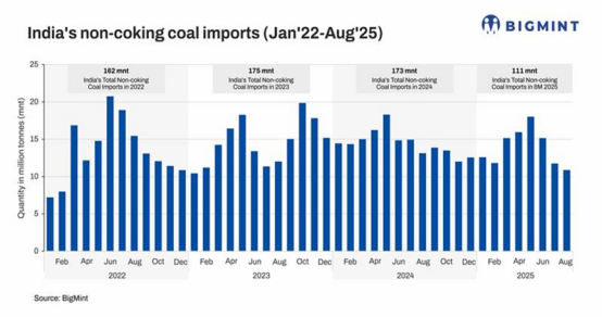 BigMint 平台9月13日发布的信息显示,2025年8月,印度动力煤(非焦煤non-coking coal)的进口量降至自2022年12月以来的最低水平。当月进口量为1087万吨,环比7月的1161万吨下降7%,较去年8月的1313万吨下降幅度超过17%。