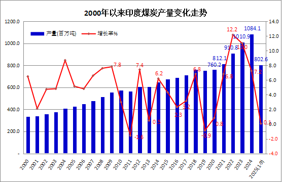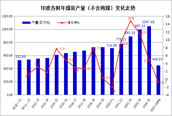 2025年1-9月印度煤炭产量同比基本持平、微增0.1%
