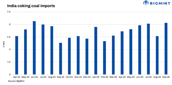 据印度BigMint 平台10月27日发布的信息,2025-26财年第二季度(2025年7月至9月),印度炼焦煤进口量为1690万吨,环比第一季度的1600万吨增长6%,与2025年财年第二季度进口量1410万吨相比,增长20%。反映出印度的钢铁行业产能和产量都有所增加。