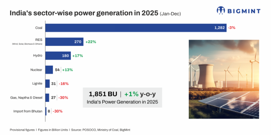 煤炭发电下降。2025年,受夏季气温温和及季风期延长导致空调需求下降9.8%影响,印度燃煤发电量较2024年下滑3%,按照国际能源署(IEA)编制的自1971年起的燃煤发电数据,2025年印度燃煤发电量下降仅是过去50多年来出现全年下降的第二次。因此,用于发电的动力煤进口需求也一直沉闷。