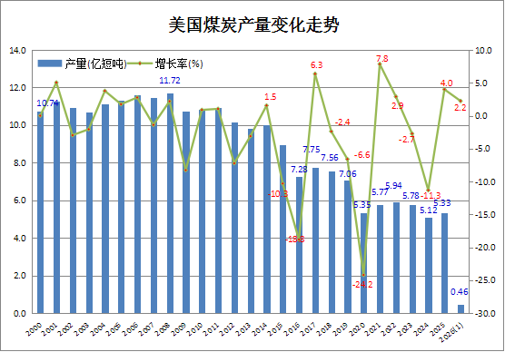 2026年1月份,美国煤炭产量继续保持增长,当月产量为4584.6万短吨(约合4160万吨),同比增加2.2%,环比增长4.6%。
