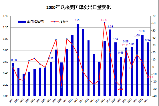 美国2025年煤炭出口大幅减少,贸易关税和全球需求不振应是主要原因。