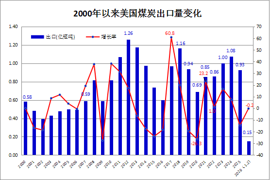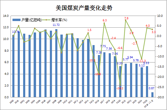 2026年1-2月美国煤炭产量同比增长3.3%,煤炭出口下降0.2%