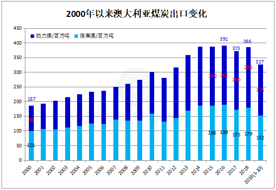 澳大利亚统计局(ABS)发布数据显示, 2019年1-10月,澳大利亚煤炭出口3.27亿吨,同比增长2%。其中,动力煤1.75亿吨,同比 增长1.2%;炼焦煤1.518亿吨,同比增加3%。