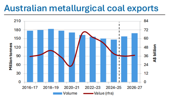 同时还预测,2025-26财年澳大利亚冶金煤出口量由2024-25财年的1.47亿吨增加到1.58亿吨,2026-27财年出口量继续增加至1.69亿吨。