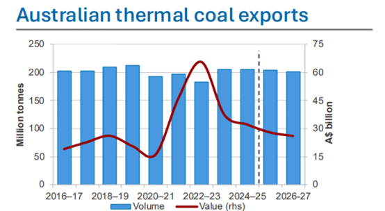 季报预测,2025-26财年(2025年7月-2026年6月),澳大利亚动力煤出口量为2.03亿吨,2026-27财年动力煤出口量可能下降至2.01亿吨。