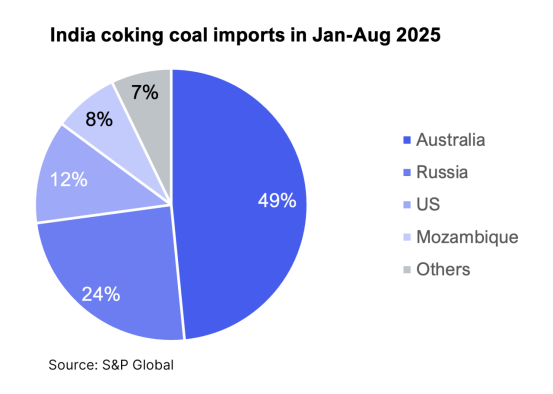 印度目前约90%的冶金煤需求依赖进口,2025年前8个月,近一半的进口煤来自单一国家——澳大利亚。